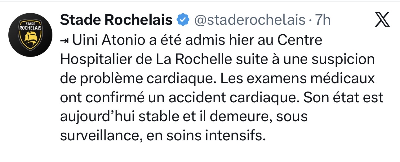 "Uini Atonio fue ingresado ayer en el Centro Hospitalario de La Rochelle debido a una sospecha de problema cardíaco. Los exámenes médicos han confirmado un accidente cardíaco. Su estado es hoy estable y permanece, bajo vigilancia, en cuidados intensivos."